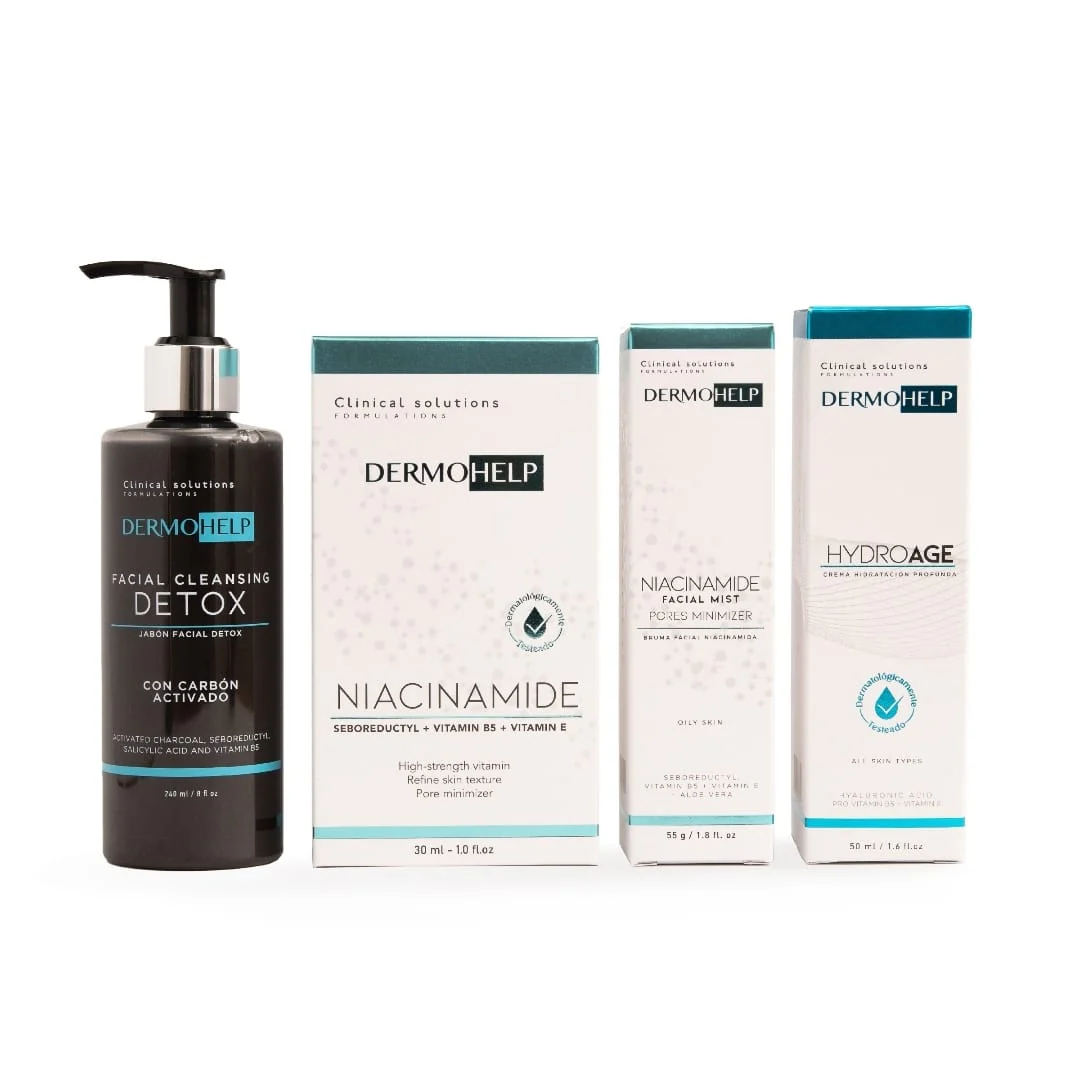 GRATIS Jabón Detox + niacinamida + hydroage + bruma de Niacinamida Este ritual logra darle un equilibrio a la piel, ayudando a disminuir la producción de grasa, logrando tener unos poros más cerrados e igualando el tono de la piel